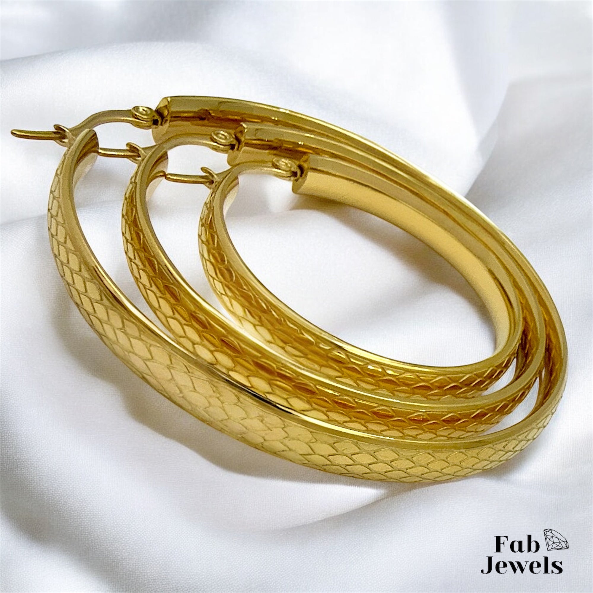 Highest Quality Snake Effect Collection , Stainless Steel Hypoallergenic Waterproof, Hoop Earrings. Highly finished with 3 layers of gold plating.