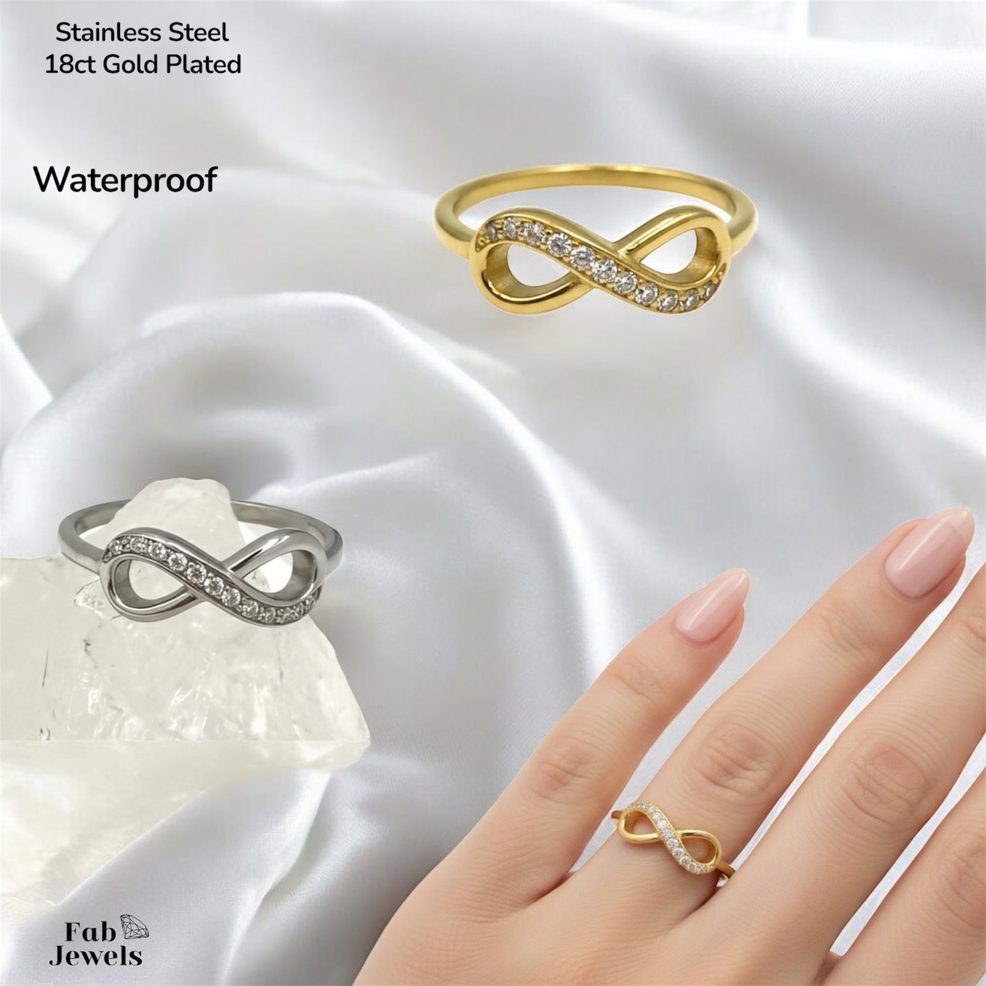 Yellow Gold Plated Stainless Steel 316L Dainty Infinity Ring.. It is nicely detailed with Inlaid Cubic Zirconia.