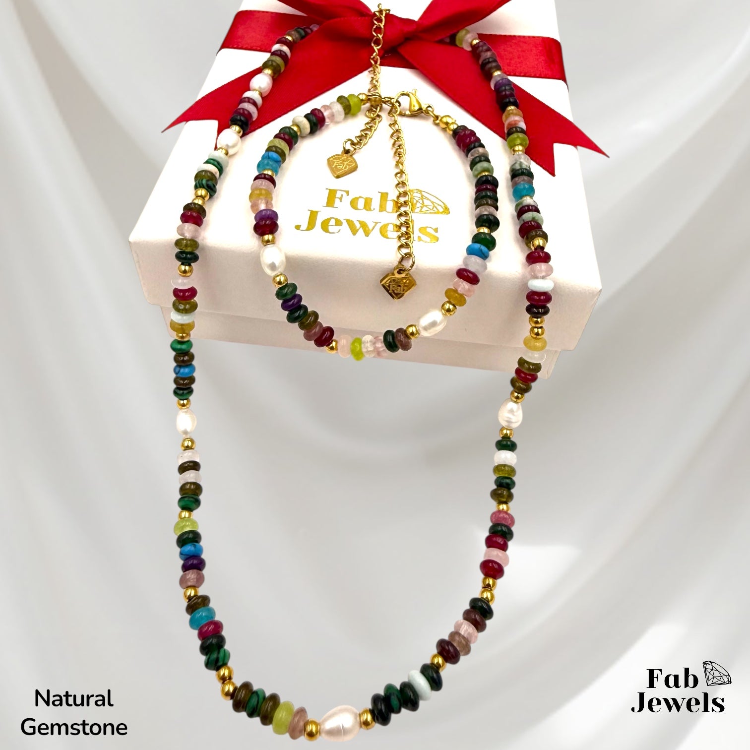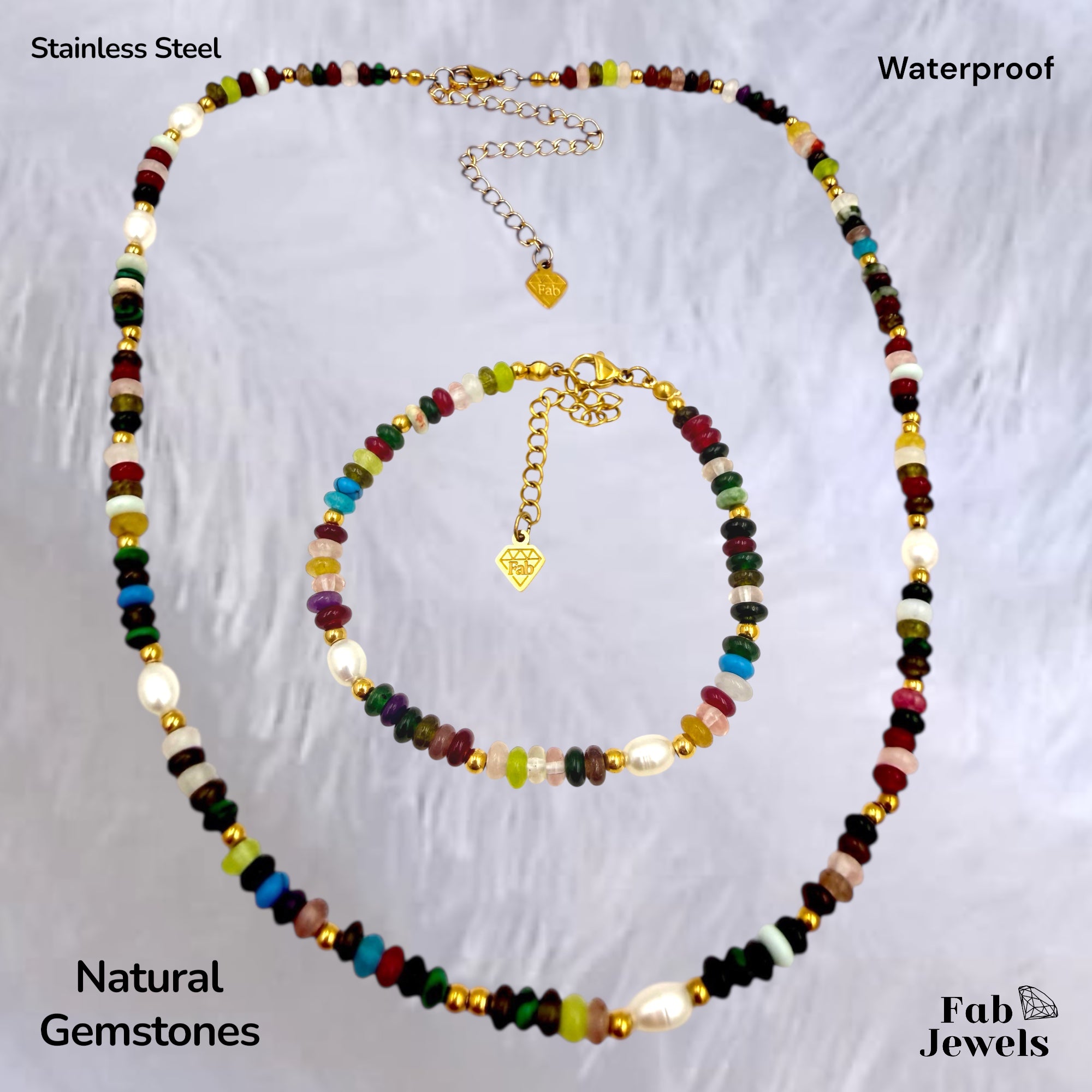 Beautiful Natural Gemstones Set ,freshwater pearls with stainless steel 18ct gold Plated clasp . It comes as a Set , Necklace and matching Bracelet. ( But you can buy them separately )