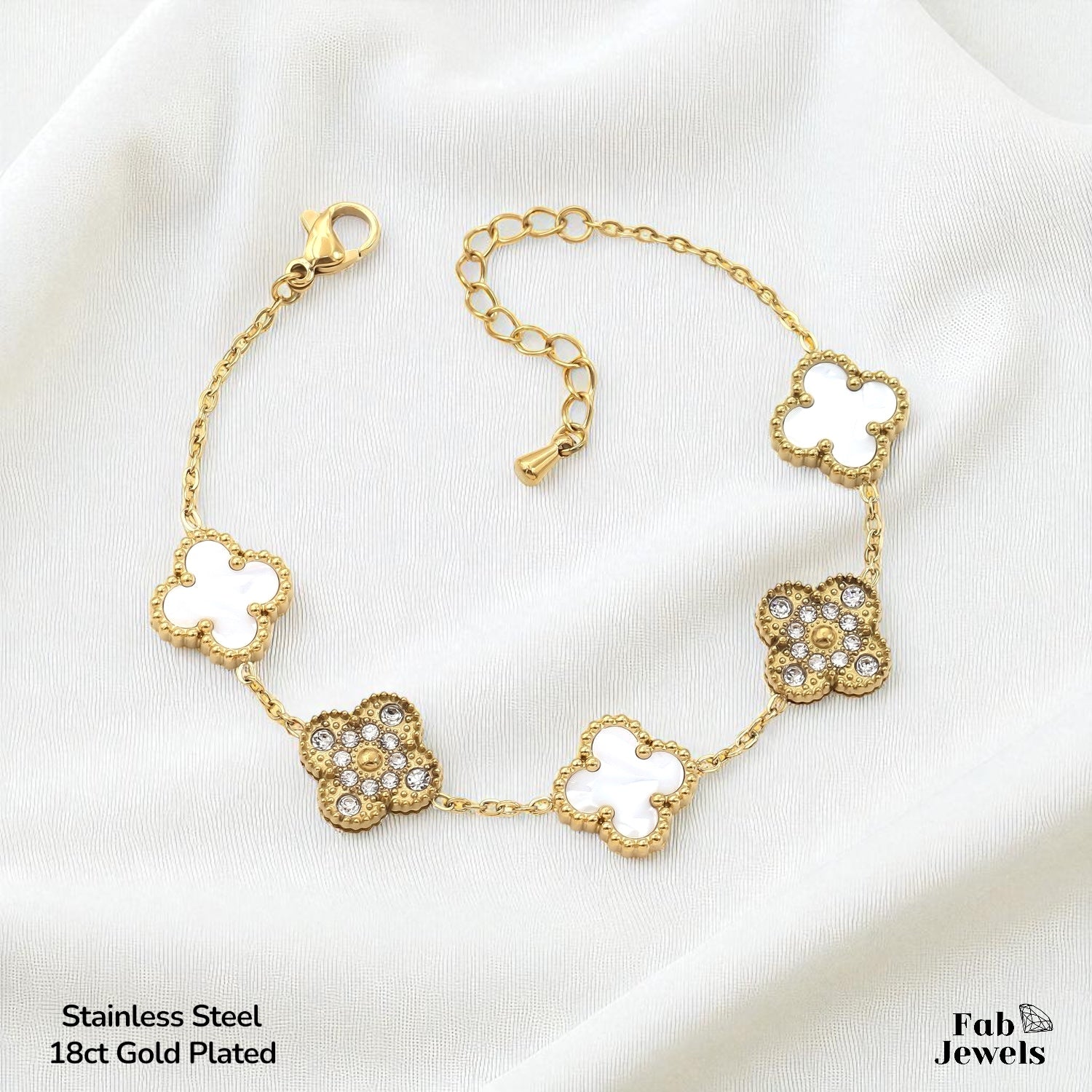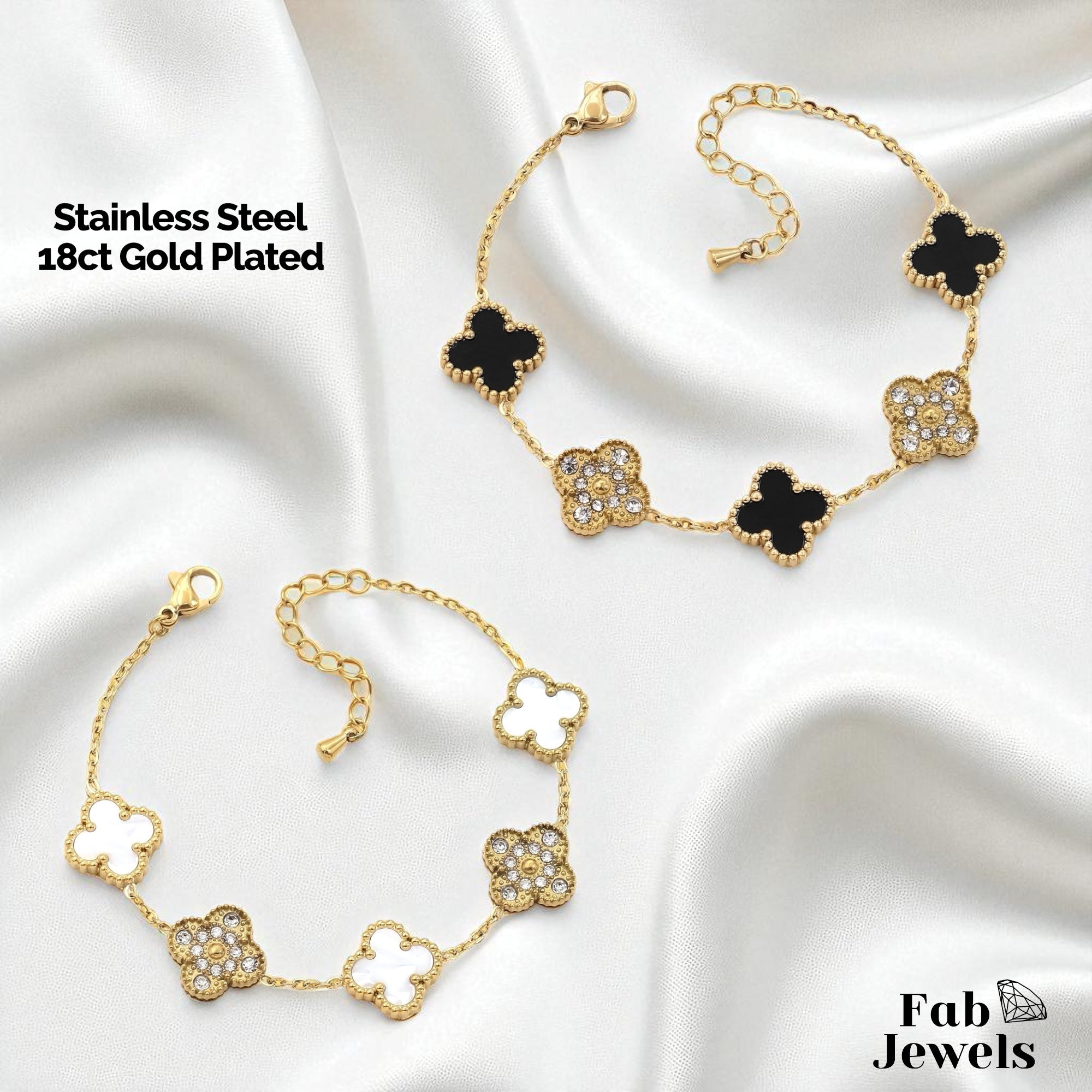 Trendy Stainless Steel 18ct Gold Plated 5 Clover Bracelet, nicely detailed with Cubic Zirconias. Available in Black or White Clover.