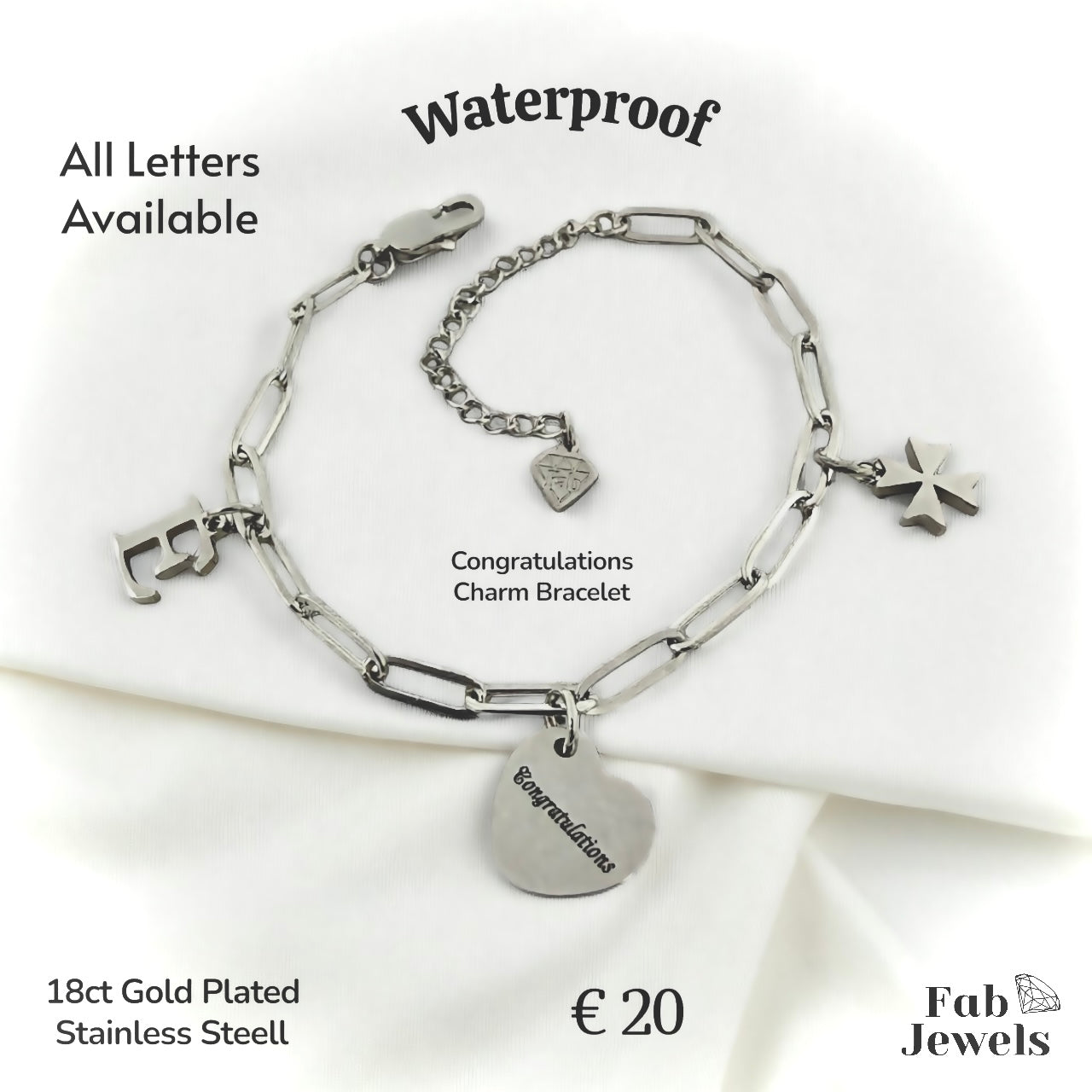 Show your gratitude towards someone by gifting them this bracelet. Create a unique and meaningful letter charm bracelet. This beautiful bracelet features a congratulations charm together with a maltese cross charm and an initial of your choice.