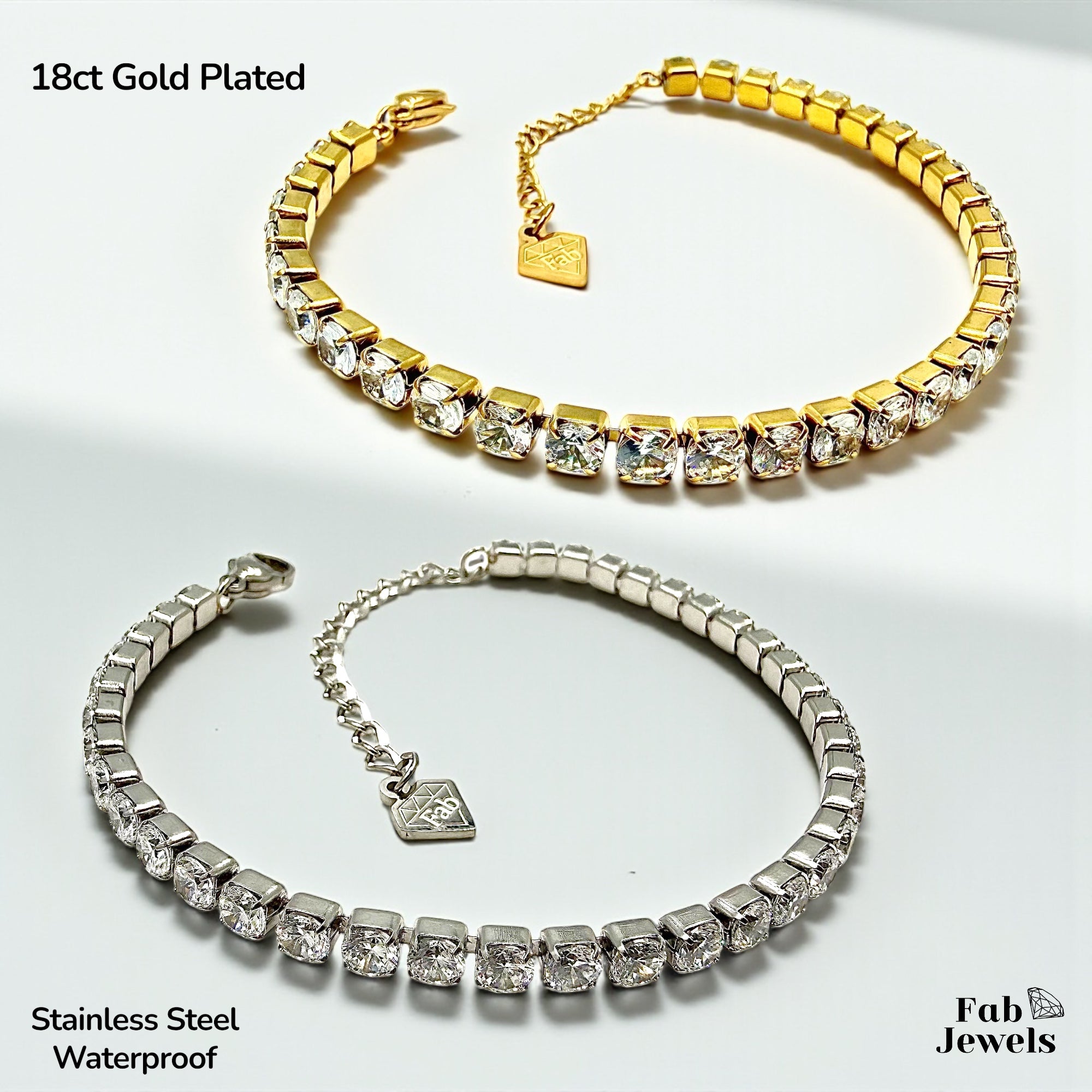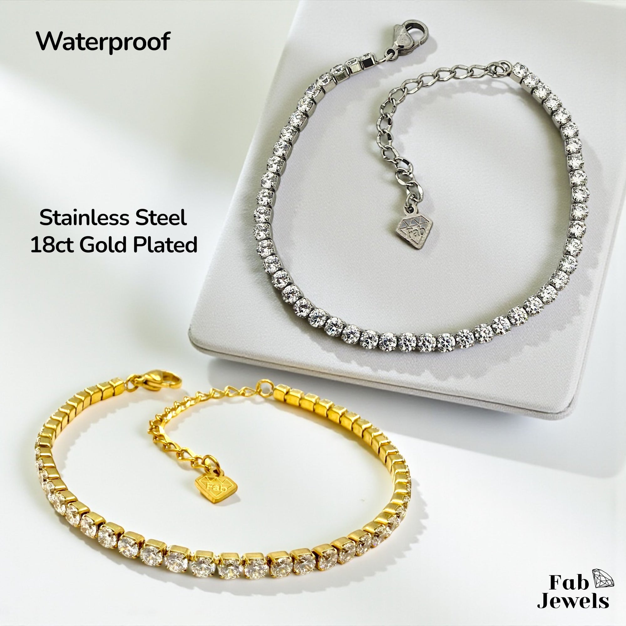 High Quality Stainless Steel Tennis Bracelet nicely detailed  with clear Sparkling Cubic Zirconia. Available in Yellow Gold Plated and Silver.