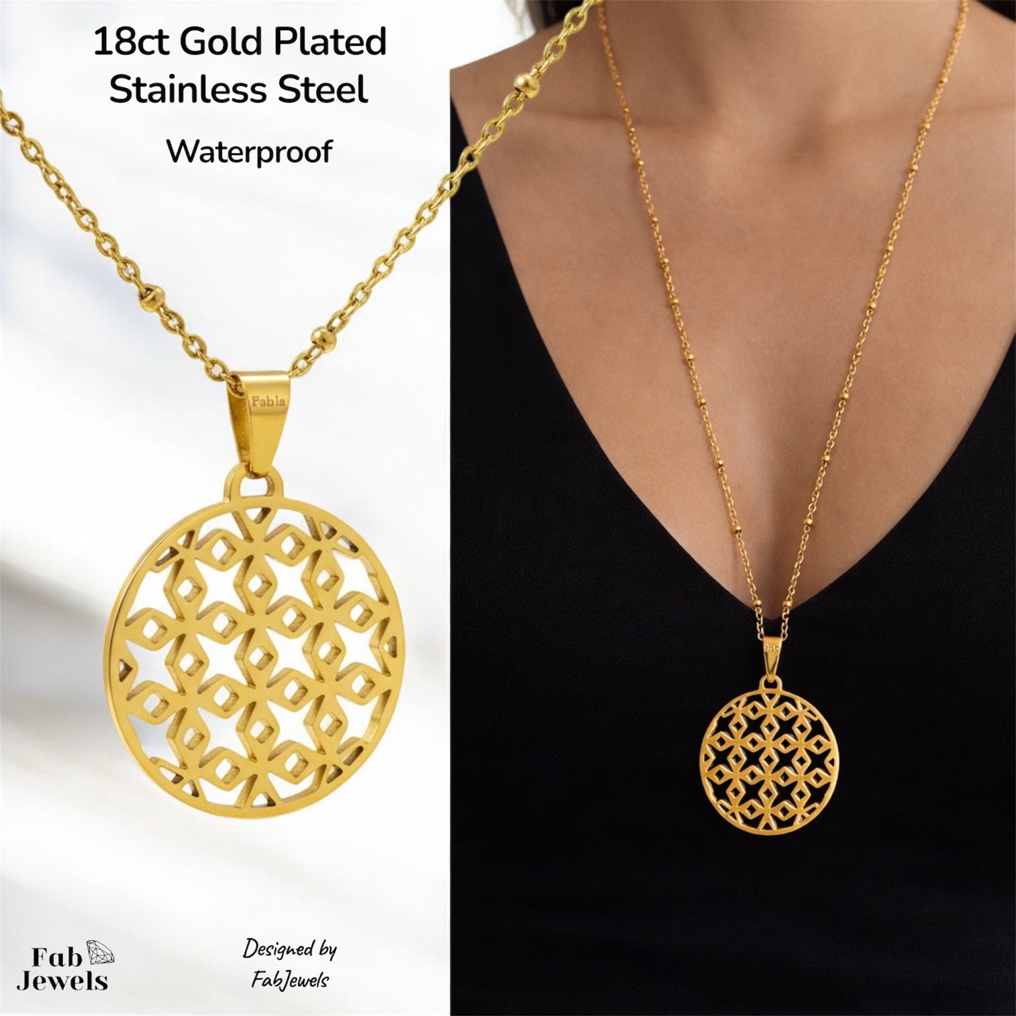 Timeless elegance meets modern craftsmanship in our Maltese Cross Pendant designed by FabJewels. Beautiful Pendant nicely designed with small Maltese crosses , comes complete with the necklace. . Embrace your Maltese Identity with this iconic Maltese Cross Pendant. ✔ Stainless steel, 18ct gold plated ✔ Waterproof & tarnish-resistant ✔ Baroque-inspired Maltese pattern ✔ Matching bangle, earrings, ring & pendant 2 different sizes to choose from. Length of Necklace: 45cm + 5 cm extension chaiIn It comes in a gift box. Free Postage