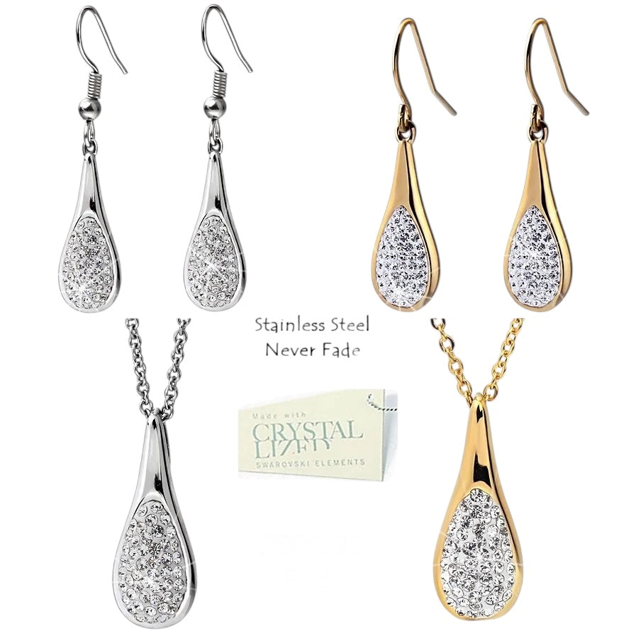 Stainless Steel 316L Stylish Necklace with Matching Earrings. This Lovely Set is Nicely detailed with Sparkling Swarovski Crystals. It is perfect for adding a touch of glam.